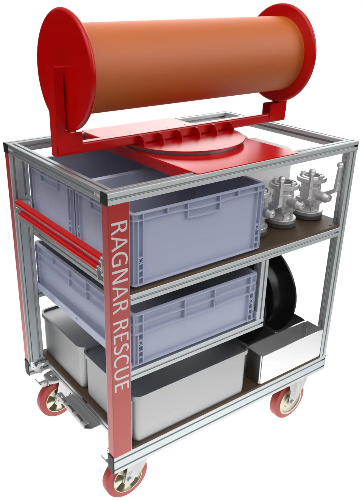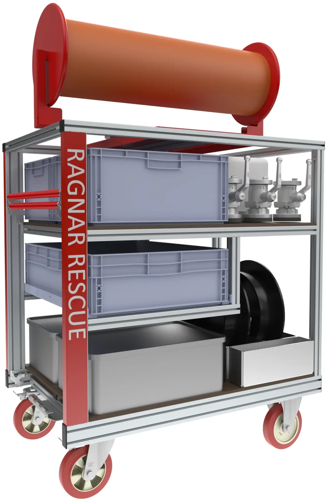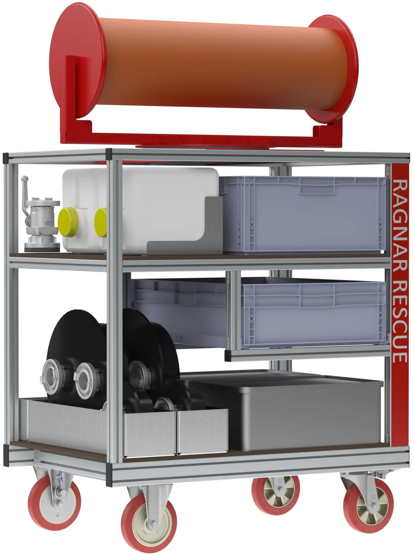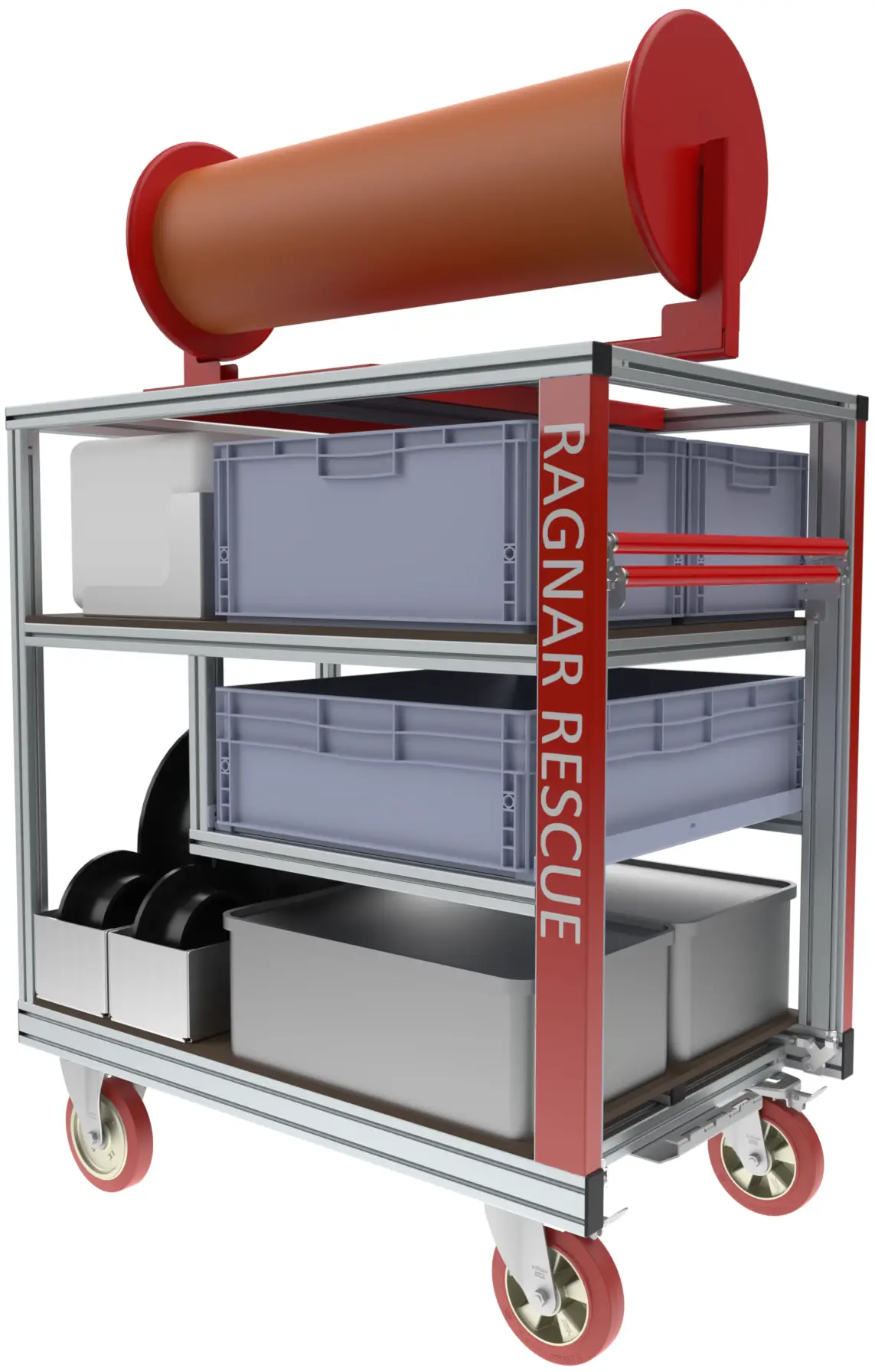 - Alle unsere Rollcontainer sind entwickelt von Einsatzkräften, konform zur AGBF-Fachempfehlung, 800kg Tragfähigkeit, 200mm Blickle-Rollen, Totmann-Trommelbremsen mit Hebelmechanik, einhändig bedienbar, hochfeste Aluminiumprofile, Maschinenbau-Qualität, professionelle CAD-Zeichnungen